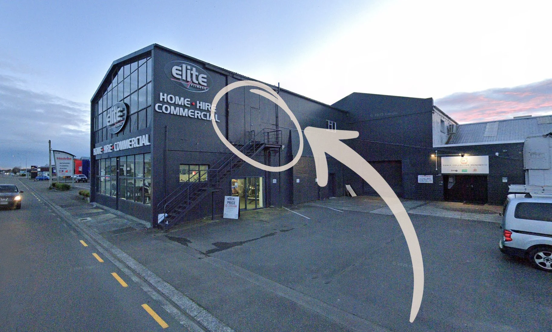 The studio is above Elite Fitness, with direct access via a stairwell on the right side of the building.